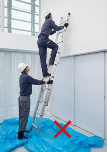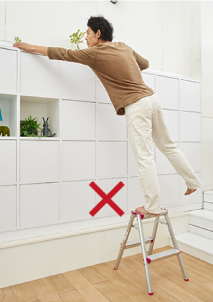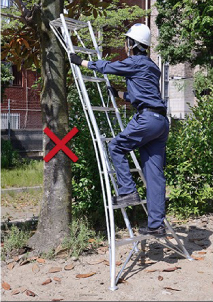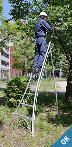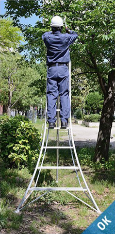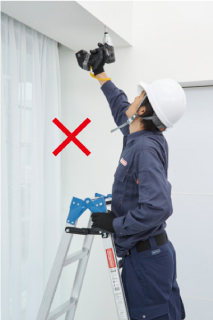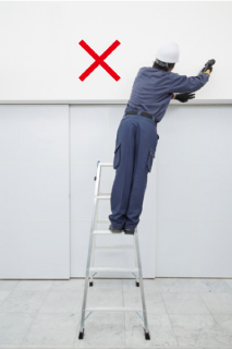 - 在梯子上進(jìn)行作業(yè)時(shí),請(qǐng)站在從天板開始數(shù)第三節(jié)(210cm以下的型號(hào)則為第二節(jié))以下的踏板上,身體輕靠天板和上層踏板,在平穩(wěn)的狀態(tài)下操作。